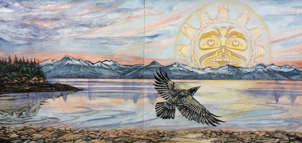 Illustrating the Raven Stories for Sealaska Heritage was a truly special point of my career. The books are part of a large collection of Native tales produced by Sealaska Heritage and sponsored by the Alaska Native Education Program grant from the U.S. Department of Education. These three stories, Raven Brings Us Fire, Origins of Rivers and Streams, and Raven and the Box of Daylight are ancient creation stories based on oral history of the Tlingit people of southeast Alaska and written by Tlingit author Pauline Kookesh Duncan. I received the completed stories, a few guidelines, and some cultural references and was set loose to envision the imagery of these densely woven tales. I was further challenged to learn the art of formline drawing—a traditional technique used by native people of the Pacific Northwest both on totem poles and in their artwork. The result was a weave of my detailed illustrations of characters and settings with formline. I valued deeply what I learned working firsthand with Tlingit people at Sealaska. To me, the books carry a potent essence of southeast Alaska and the people who have called it home for thousands of years, and are enchanting for children and adults alike! The public and educators can purchase the books for the classroom or personal use via the Sealaska Heritage online store.