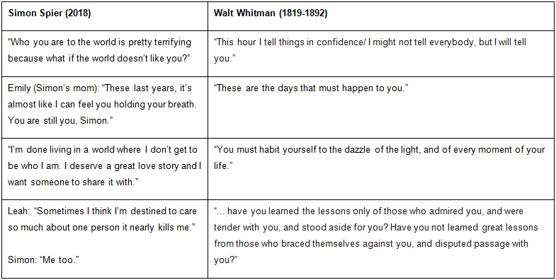 Flash-forward to yesterday. It’s 25 years later, and I am both dramatically different, and exactly the same (“Do I contradict myself? Very well, then I contradict myself, I contain multitudes.”) My daughter Zoey, an actual teenager in a matter of days, is by my side because we couldn’t wait to see Love, Simon, a coming of age/coming out story that had me hooked with the first glimpse of Katherine Langford of 13 Reasons Why fame. As we watched, I realized that my promise to myself so many years ago to be enough, and to help others to see that they are too, is probably my actual life’s work, not teaching. Teaching is just the vehicle for the journey. When Zoey and I were both in tears as Simon sorted through his very public existential crisis, I couldn’t help but draw parallels between Simon and Walt, my old friend. This, of course, got me thinking about ways I could incorporate poetry during April, both National Poetry Month and, for me, lots-of-state-assessments month. I don’t have time for a poetry unit per se, but I’m thinking of making a display of quotes from Love, Simon that I can then line up with parallel Whitman quotes. Here are a few that might capture the attention and imagination of my middle level kiddos, helping them to know that they are enough.