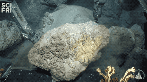 (Left) The Remotely Operated Vehicle (ROV) Jason II collecting the largest pumice sample ever recovered from a deep-sea volcano. (Right) Credit: Remotely Operated Vehicle (ROV) Jason II traversing across the deep ocean. ©Woods Hole Oceanographic Institution 2018