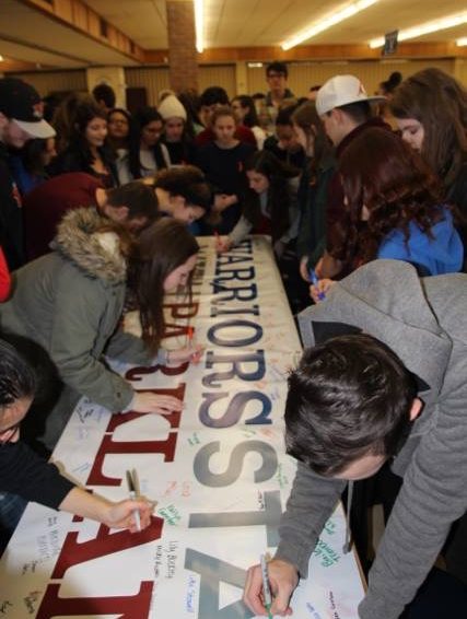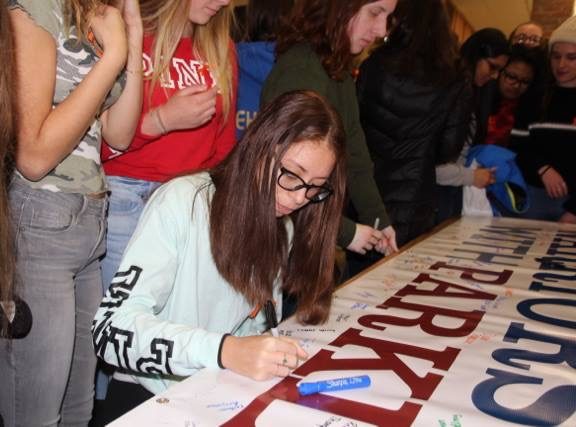 Students signing a banner to send to Parkland, Florida, during the walkout on March 14th. Photo credit: 13WHAM.com |